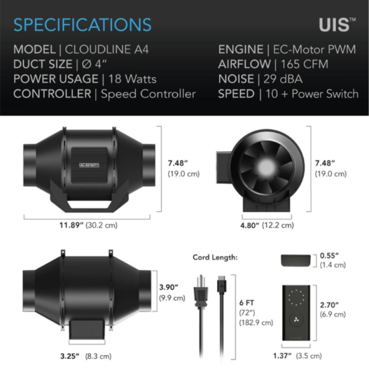 AC Infinity wentylator CLOUDLINE A4 100mm 280m3/h 10 trybów + kontroler prędkości