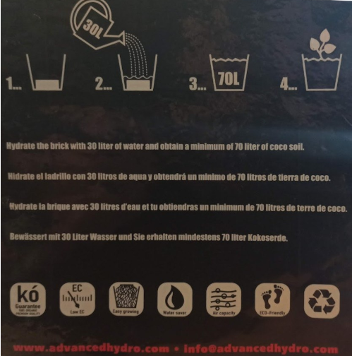 Advanced Coco XL to sprasowany substrat z włókna kokosowego, który po dodaniu około 30 litrów wody przekształca się w 70 litrów gotowego do użycia podłoża. Produkt został przygotowany z muszli orzecha kokosowego (kokos) z zachowaniem wysokich standardów jakości. Proces produkcji zapewnia stabilne pH (ok. 5,8–6,8) oraz bardzo niski poziom soli (EC < 0,5 mS/cm).
