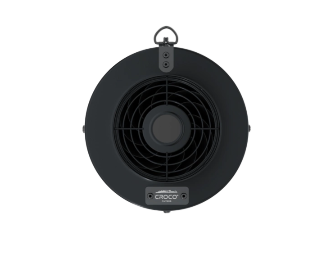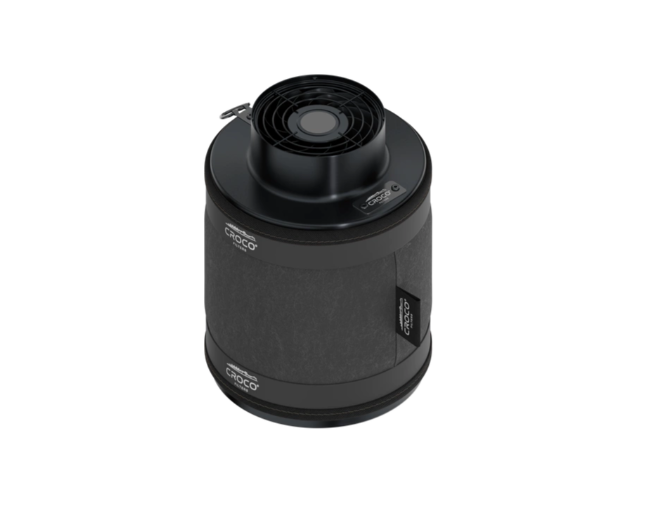 Wymienny wkład: przy zużyciu filtra wystarczy podmienić sam wkład CROCO BLACK F100×200 (160–240 m³/h, fi 100 mm) i przełożyć przyłącze z wentylatorem.
