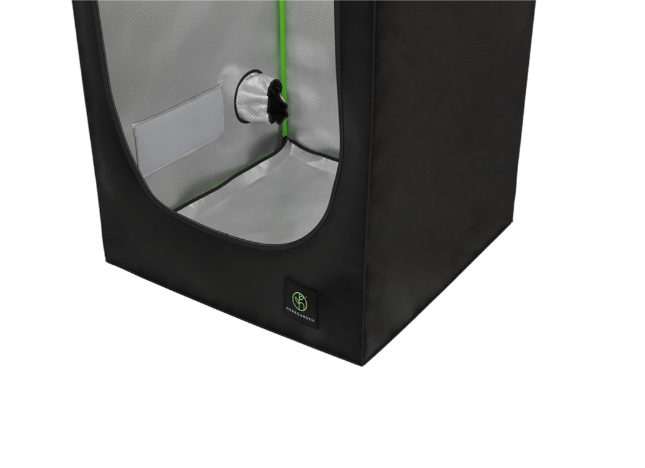 Wnętrze namiotu wykonano z odblaskowej folii MYLAR 210D Diamond w wersji Silver. Materiał poprawia rozprowadzenie światła w całej przestrzeni, co wspiera bardziej równomierne doświetlenie roślin. Istotnym detalem jest dodatkowe obszycie zamka od środka, które ogranicza ucieczkę światła na zewnątrz i pomaga utrzymać stabilny fotoperiod. Poszycie jest wodoszczelne i nieprzepuszczające światła, a materiał można czyścić i prać, co ułatwia dbanie o higienę w growboxie.