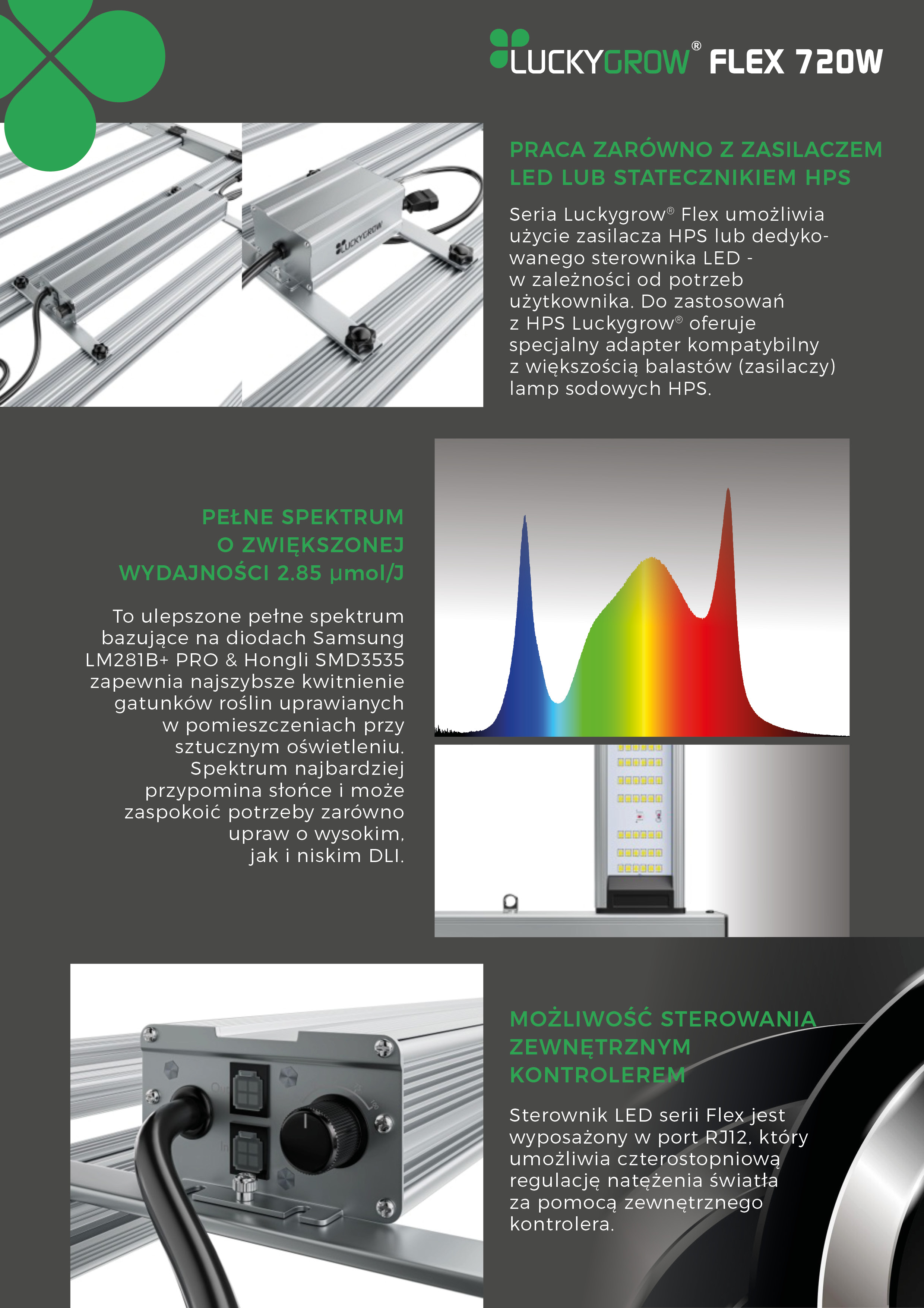 Uwaga dot. zasilania: ta oferta obejmuje sam moduł LED. Do poprawnego działania należy zastosować LUCKYGROW DRIVER 720W (zalecany) lub użyć adaptera LUCKYGROW do zasilacza HPS 600 W (jakość i moc zasilacza HPS wpływa na uzyskiwaną moc modułu). Funkcja sterowania RJ12 jest dostępna wyłącznie w wariancie z zasilaczem LED.