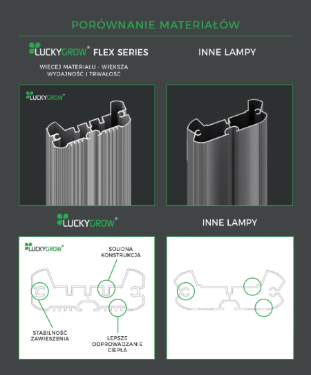 LUCKYGROW FLEX 720W to wysokowydajny moduł LED do profesjonalnych upraw i wymagających projektów hobbystycznych. Zbalansowane pełne widmo PAR (białe + głęboka czerwień 660 nm) wspiera silny wzrost wegetatywny oraz obfite kwitnienie. Konstrukcja pasywnie chłodzona pracuje cicho i bezobsługowo, a wbudowany ściemniacz umożliwia szybkie dopasowanie intensywności światła.