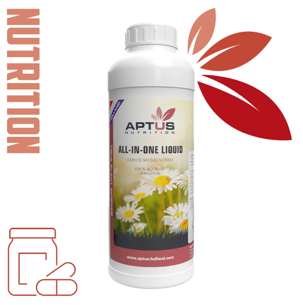 Aptus All-in-One Liquid to kompleksowy, mineralny nawóz w płynie, który wspiera zdrowy rozwój roślin w każdej fazie wzrostu. Zawiera niezbędne pierwiastki: azot, fosfor, potas, magnez oraz mikroelementy: bor, molibden, żelazo, mangan, cynk i miedź. Dzięki unikalnemu procesowi produkcji nie jest wrażliwy na zmiany pH, co pozwala na stosowanie go w szerokim zakresie podłoży i mediów: glebie, torfie, wełnie mineralnej i systemach hydroponicznych.