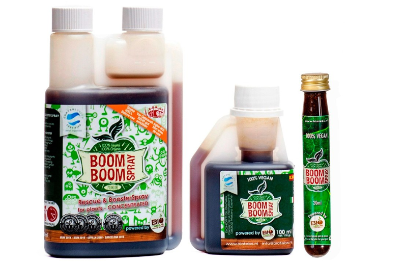 BioTabs Boom Boom Spray to roślinny biostymulator w 100% organiczny. Według opisu zawiera naturalne aminokwasy, peptydy, węglowodany i minerały. Preparat może być stosowany antystresowo, odżywczo oraz wzmacniająco. Wskazano, że pomaga roślinom przezwyciężyć stres związany z ekstremalnym zimnem, wysokimi temperaturami, słabym oświetleniem, odwodnieniem i przeciągami powietrza. Dodatkowo dostarcza „doładowanie” azotu, wspierające tworzenie błyszczących, ciemnozielonych liści, zwłaszcza w początkowej fazie wzrostu, oraz ma stymulować wzrost i przyswajanie składników mineralnych.