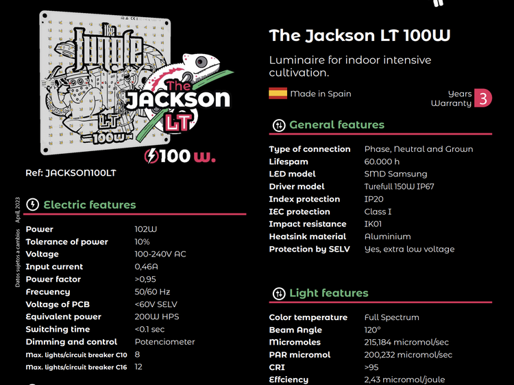 The Jackson Lite 100W to kompaktowa płyta LED nowej generacji zaprojektowana w Hiszpanii do całego cyklu uprawy – od wegetacji po kwitnienie. Pełne spektrum światła, markowe diody Samsung, ściemnianie pokrętłem i pasywne odprowadzanie ciepła zapewniają stabilne warunki, cichą pracę i niski pobór energii. Konstrukcja typu „plug & play” pozwala rozpocząć pracę w kilka minut.