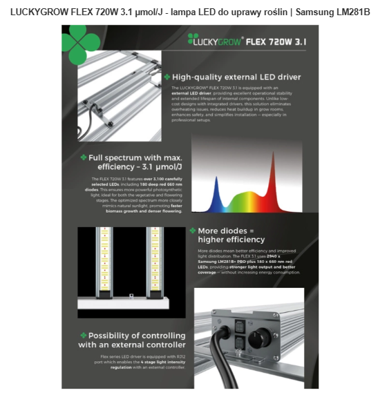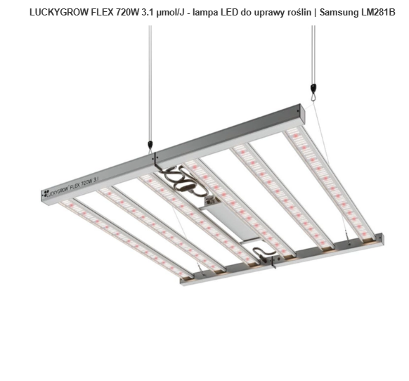 LUCKYGROW FLEX SERIES 720W 3.1 to nowa generacja lamp LED stworzona z myślą o efektywnym i energooszczędnym doświetlaniu roślin w każdym stadium rozwoju – od kiełkowania, przez wegetację, aż po intensywne kwitnienie. Dzięki najnowszym diodom Samsung LM281B+ PRO oraz czerwonym diodom Hongli 660 nm, lampa zapewnia maksymalne wykorzystanie światła PAR, gwarantując wzrost plonów przy niższym zużyciu energii.