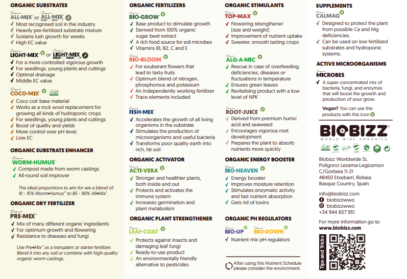 Stosuj regularnie, obserwuj reakcję roślin i w razie potrzeby skoryguj dawki zgodnie z tabelami BioBizz.
