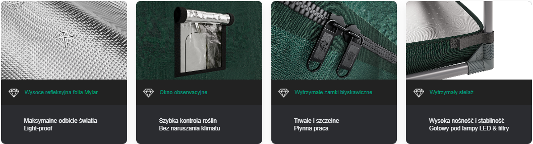 Stabilny stelaż stalowy 19 mm i wzmocnione łączniki bezpiecznie udźwigną nowoczesne lampy LED i filtry węglowe. Dwa okna obserwacyjne 30×25 cm umożliwiają szybki podgląd bez naruszania klimatu, a podwójne ściągacze utrzymują szczelność przy kanałach i przewodach.