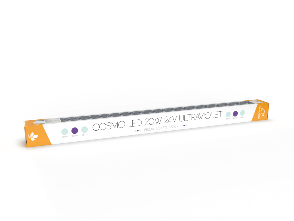 Cosmorrow® LED UV 20 W dodaje ultrafiolet (365 nm) na osobnym kanale, dzięki czemu precyzyjnie dozuje się UV jako dodatek do głównego światła. UV pomaga ograniczać rozwój pleśni, zwiększać grubość liści oraz kompaktować pokrój (krótsze międzywęźla). Smukła, szczelna konstrukcja IP65 i żywotność do 50 000 h sprawdzają się w growboxach i szklarniach o pokryciu do ~50×30 cm. Listwę łatwo połączysz z innymi widmami Cosmorrow® (Grow/Bloom/IR), budując własny, wielokanałowy zestaw.