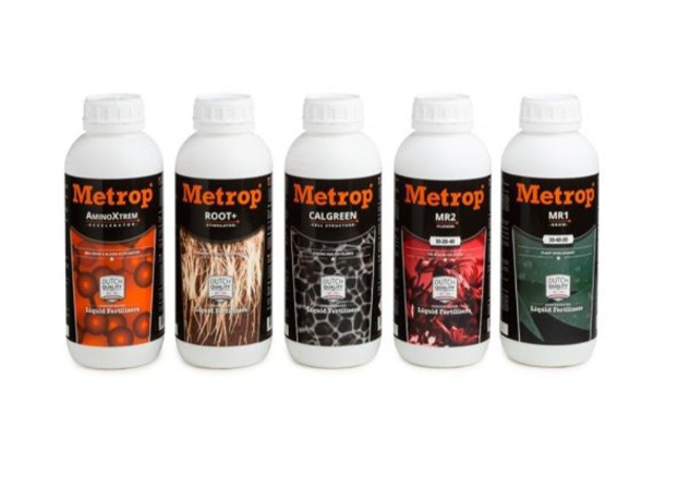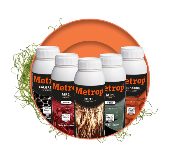 Kompletny pakiet odżywek Metrop na cały cykl uprawy, kompatybilny ze wszystkimi podłożami (gleba, kokos, hydro, wełna mineralna). Zestaw łączy bazowe nawozy MR1 (wzrost) i MR2 (kwitnienie) z dodatkami: Calgreen (Ca+N na mocne tkanki i lepsze pobieranie), Root+ (intensywny rozwój korzeni) oraz AminoXtrem (stymulator kwitnienia z wolnymi aminokwasami). Dołączona tabela dawkowania ułatwia prowadzenie roślin krok po kroku.