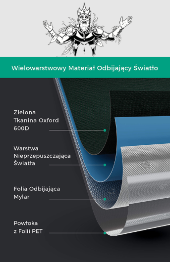 Wnętrze: refleksyjny MYLAR Diamond 600D + warstwa światłoszczelna + folia PET