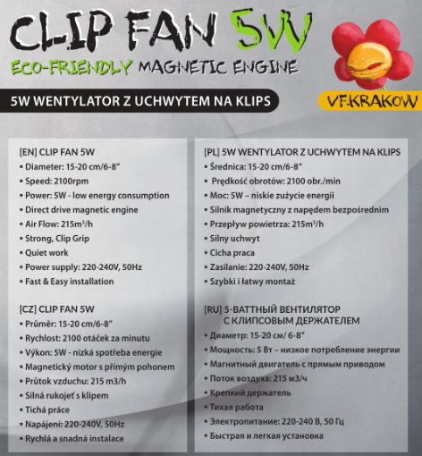Clip Fan 5W to wysokiej klasy wentylator cyrkulacyjny zaprojektowany z myślą o uprawach w namiotach i growboxach, gdzie liczy się stabilny ruch powietrza, niski pobór prądu i cicha praca. Zastosowano w nim technologię silnika magnetycznego z napędem bezpośrednim, która ma zapewniać wysoką kulturę pracy oraz długą żywotność. Według opisu rozwiązanie zużywa około trzy razy mniej energii niż klasyczne konstrukcje (5 W odpowiada typowemu wentylatorowi 15 W), co ułatwia oszczędną eksploatację przy pracy ciągłej.